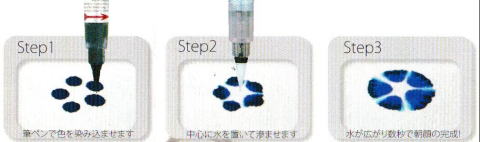 滲む紙と水で、自然にきれいなグラデーションができるので、絵や文字に自信がない人にも安心です。技法や手本も豊富にあります。